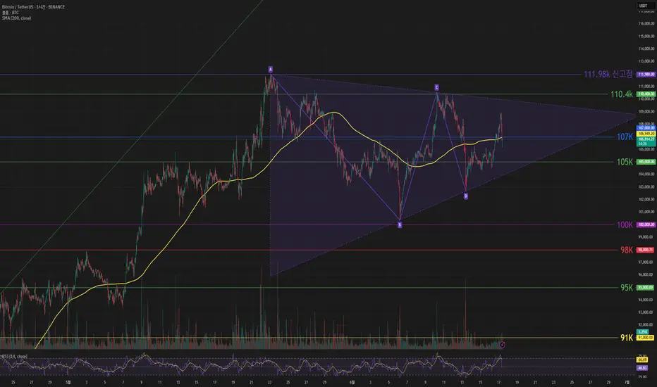 하락 관점으로 105k 아래로 떨어지며 수렴 하단 벗어날 경우 100k 까지도 열어놓고 대응해야 할 것 같습니다.