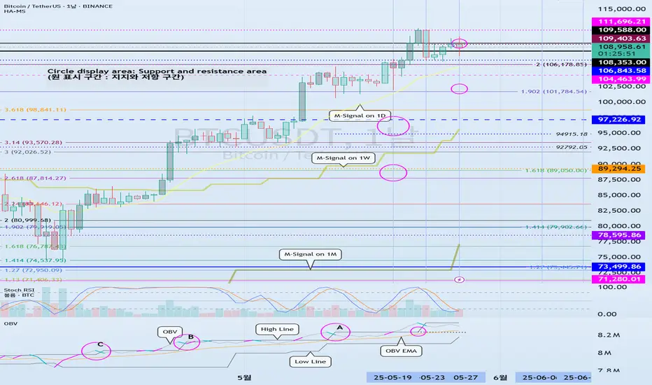 HA-High 지표가 108316.90 지점에 생성되려는 모습을 보여주고 있기 때문에 결국 108316.90 부근에서 지지 여부가 관건이라 할 수 있습니다.