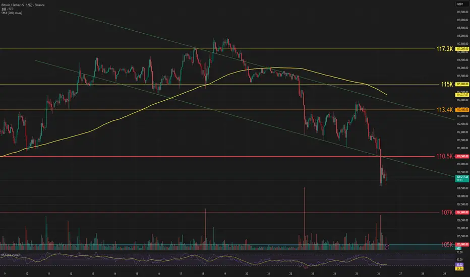 비트코인 가격은 미국 증시하락과 함께 110.5k 아래로 내려오며 108.7k 까지 내려온 후 횡보 중입니다. 110.5k 위로 다시 회복한다면 하락 모멘텀이 감소했다고 생각할 수 있을 것 같습니다. 아직까지 하방 압력이 크기 때문에 107k 까지는 열어 놓고 대응이 필요해 보입니다.
