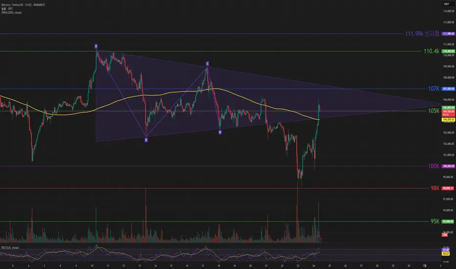 하락 관점으로 200 이평선과 104k 에서 지지받을 것으로 보이고 103k 아래로 내려온다면 100k 까지 열어놓고 대응해야 할 것 같습니다.