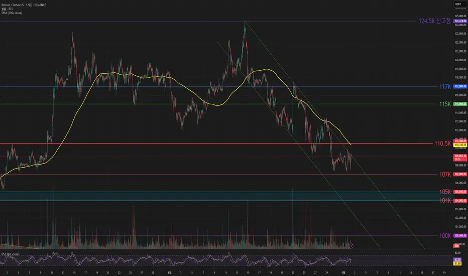 하락 관점으로 107K 아래로 떨어진다면 104~105K 지지구간 까지 열어놓고 대응해야 할 것 같습니다.