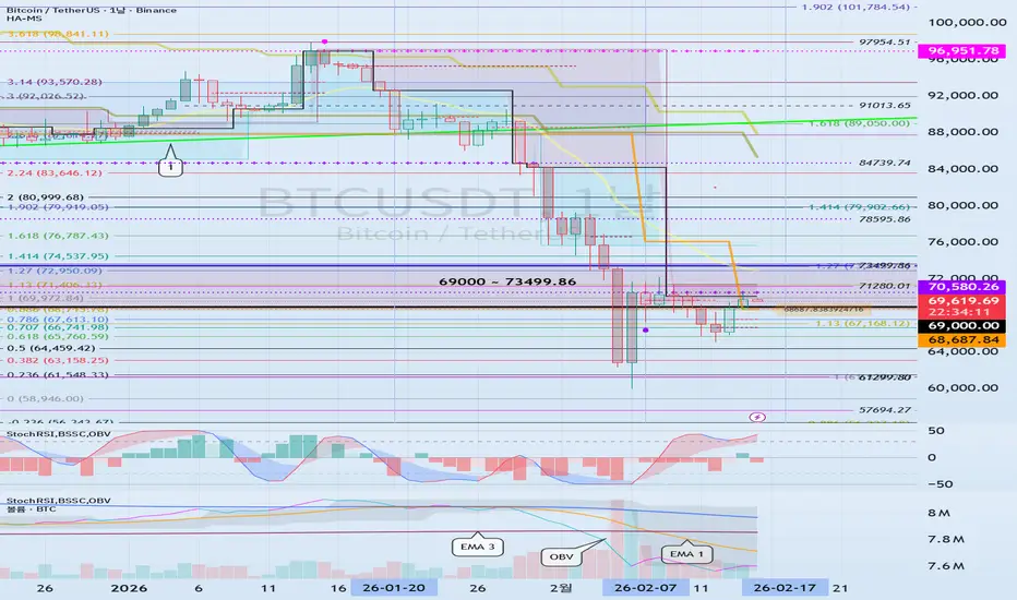 이에 따라서, 68687.84 ~ 70580.26 구간에서 지지 받고 상승할 수 있는지가 관건입니다.