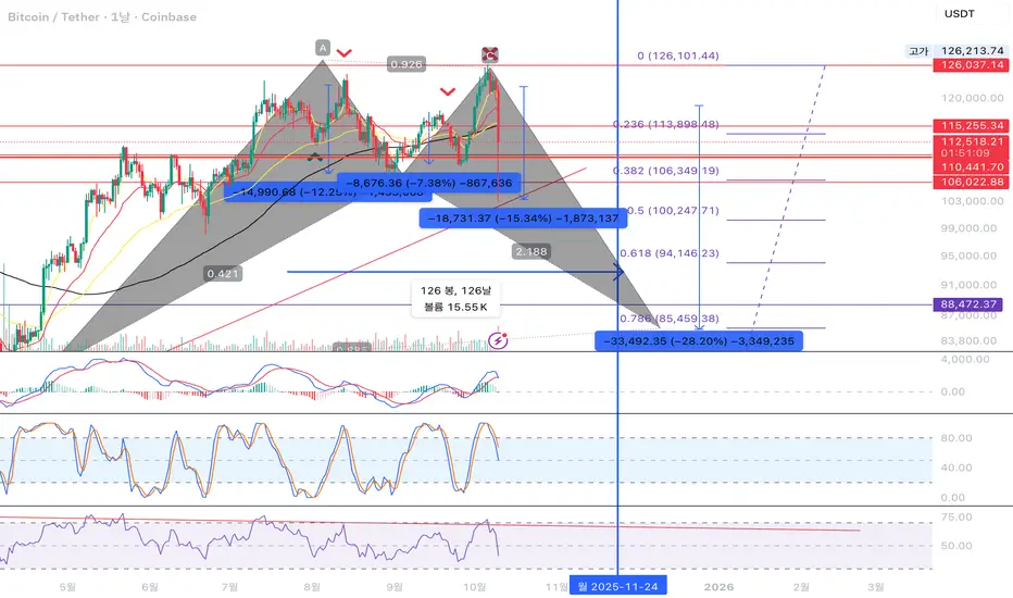 비트코인(BTC)의 하락을 지속적으로 말씀드려왔던 터라 오늘의 움직임이 이상하다고 느껴지진 않습니다. 이번 달 양봉으로 시작한 10월이 이제 음봉으로 전환되며 개인적으로는 106K 언저리에서 마감이될 것으로 판단되며 다음 달 추가적으로 하락이 발생할 것으로 보입니다. 11월 중순부터는 이제 슬슬 알트들의 반등이 나타날 것으로 생각하기 때문에 그 때는 전체적으로 롱 포지션을 위주로 잡을 생각입니다. 비트코인은 이제 120K 위로 움직임 발생하지 않는다면 지속적인 우하향이 발생하여 최종 93K - 86K 수준을 11월 말까지 보고 있습니다. 토요일 15%가 하락한 비트코인이며 나스닥, S&P도 4%하락하였습니다. 당분간 조심하시길 바랍니다.