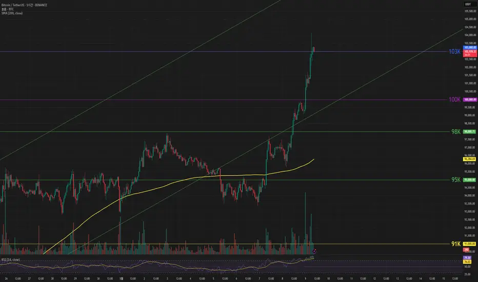 비트코인 가격은 동안 가격 상승을 압박했던 글로벌 무역 긴장이 완화될 것이라는 기대감이 작용하며 미국 증시를 따라 상승했습니다. 현재 100k 위로 상승하며 104k 위로 올랐다가 조정하락이 오면서 103k 부근에서 가격 형성중입니다. 이대로 103k 지지선 만들면서 횡보하거나 상승채널 하단 따라 상승하며 RSI 과매수 상태를 해소한다면 추가적인 상승도 가능할 것으로 보입니다.