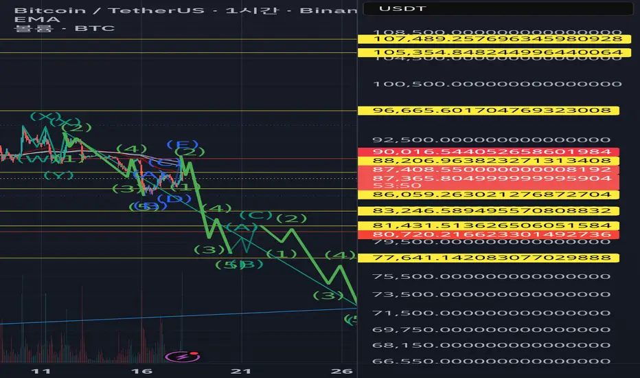 직전 게시글에서 87.7 침범시 추가하락이 유력하다고 말했었습니다. 오늘 복합파형에서 z파의 하락에 대한 리딩다이아고날이 진행됨으로써 하락에 대한 쐐기가 박혔다고 해석됩니다. 단기로 해당과 같은 지옥의 하락세가 예상되오니 바닥이랍시고 매수하기보단 조금 보수적으로 매매하심을 권장드립니다 해당 관점은 94.2k를 상방돌파시 철폐입니다