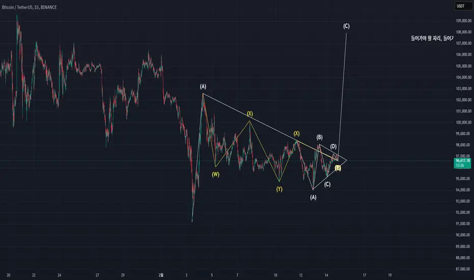 A파 연장된 지그재그 이후 B파가 삼중 복합조정으로 다나왔다고 판단됩니다. B파의 Z파가 삼각수렴으로 진행중으로 보이고, 삼각수렴의 E파 완성시 전체 C파가 임펄스 파동의 형태로 급격한 상승 기대해봐도 좋을거같네요..