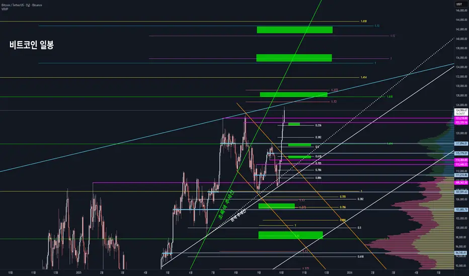 비트코인 일봉 차트입니다. 오늘 오후 1시에 비트코인이 전 역대 고점이었던 124,500 부근을 돌파 성공해줬습니다.