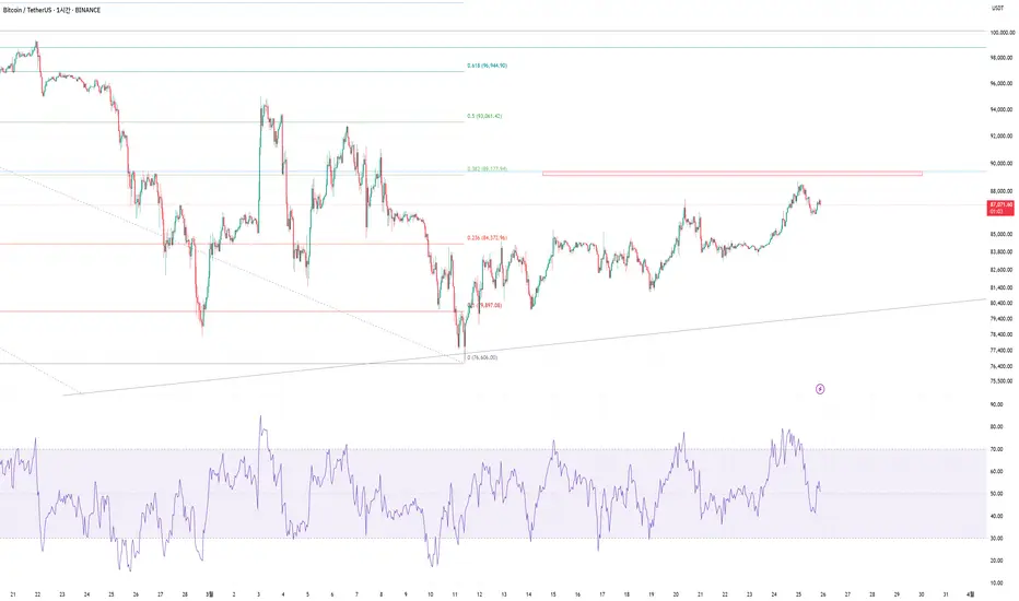앞서 말씀드린 대로, 단기 저점 76,000에서 목표로 설정했던 90,000에 근접한 가격까지 도달했습니다.