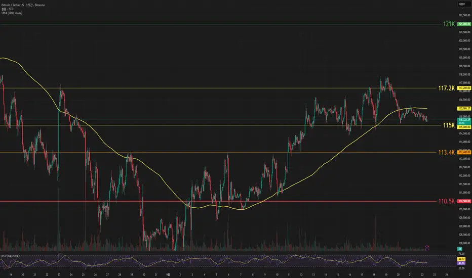 비트코인 가격은 115k 위에서 횡보하고 있습니다. 이대로 200 이평선 위로 다시 오르며 117.2k 돌파한다면 추가 상승을 기대해 볼 수 있을 것 같습니다.
