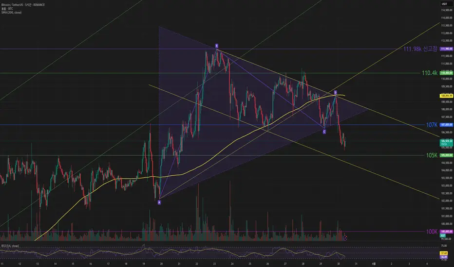 하락 관점으로 105k 아래로 떨어지면 103k 까지 떨어질 수 있어 주의가 필요해 보입니다.