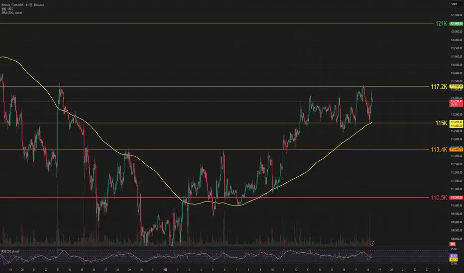 하락 관점으로 115k와 200 이평선 아래로 떨어질 경우 113.4k 에서 지지받을 것으로 보이고, 추가 하락이 온다면 110.5k 까지 열어놓고 대응이 필요해 보입니다.