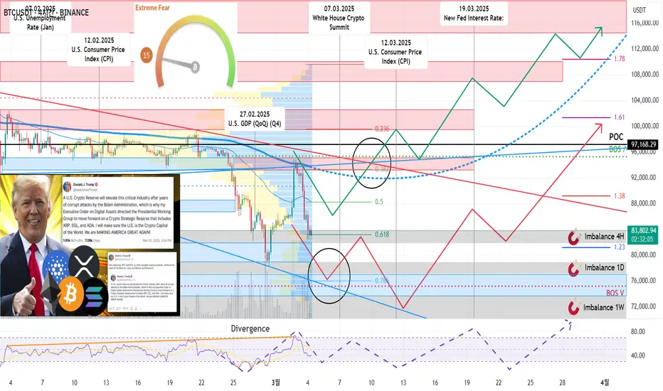 암호화폐 시장이 조정을 거친 후, 도널드 트럼프가 비트코인뿐만 아니라 알트코인도 미국 국립준비제도에 포함하겠다는 게시물로 인해 반등했습니다. 그 사이 비트코인 가격은 95,000의 주요 수준 아래에서 다시 테스트되었습니다. 이 수준은 오랫동안 지지 수준이었고, 현재는 저항 수준입니다. 하지만 구매자들은 아직 그것을 극복할 힘이 없습니다. 현재 하락의 이유는 캐나다, 멕시코, 중국산 상품에 대한 관세가 최종 승인되었기 때문입니다. 수정이 계속되고 매도자가 78,000의 지원 수준을 돌파하는 데 성공하면 가격이 0.78 피보나치 수준으로 떨어지고 70,000~75,000 범위에서 지원 추세선이 재테스트될 것으로 예상됩니다. 불균형 1W 구역 70,000~73,000에는 거래량 수평 수준에 거래로 닫아야 할 큰 갭이 있습니다.