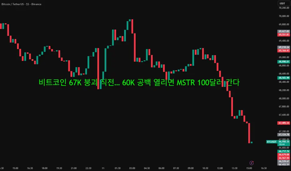 그래서 만약 6만 7000달러가 깨지면, 다음으로 의미 있는 지지대인 6만 달러 부근까지 빠르게 내려갈 수 있다는 시나리오가 나오는 겁니다.