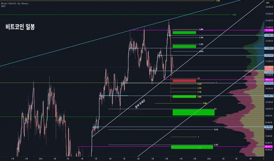 해당 추세선이 하방 이탈될 경우, 추가적인 하락이 전개될 가능성이 높습니다. 특히 이탈 이후 일봉 종가가 추세선 아래에서 마감된다면, 하락 시나리오에 더 큰 무게를 둘 수 있습니다.