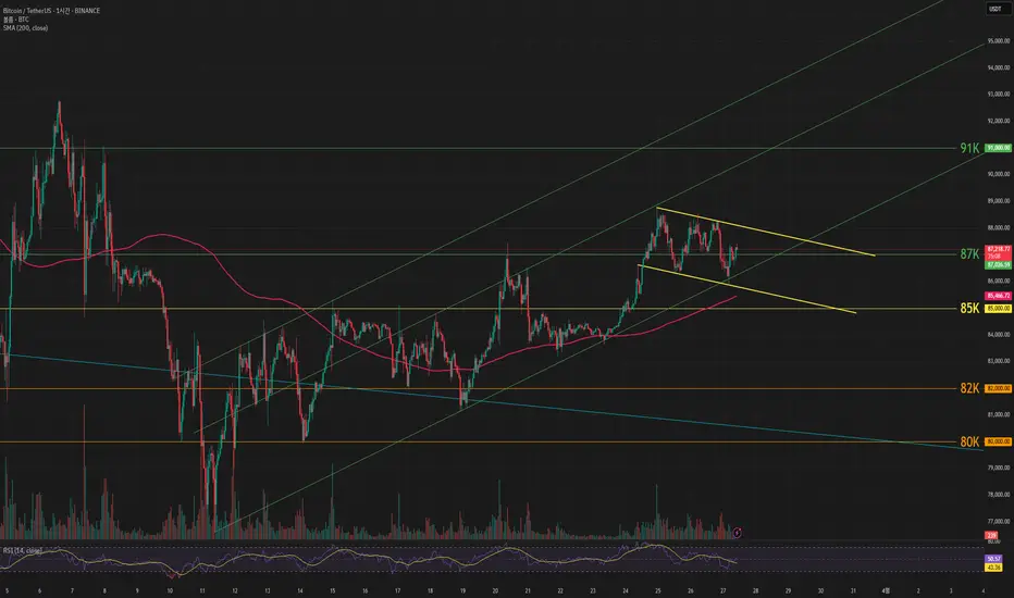 비트코인 가격은 86k 아래로 떨어졌다가 87k 부근까지 올라 온 상태입니다. 200이평선과 상승채널 하단 지지받으면서 횡보하고 있고, 88k 위로 안착하면 추가 상승을 기대해 볼 수 있을 것 같습니다.