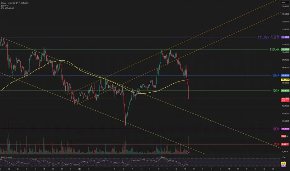 비트코인 가격은 이스라엘의 이란선체공격소식으로 하락하며 200이평선과 107k 아래로 떨어졌고, 105k 까지돌파해 하락중입니다. 104k나 103k 에서 지지받을 것으로 보이고 추가하락이 온다면 100k까지 열어놓고 대응해야 할 것같습니다.