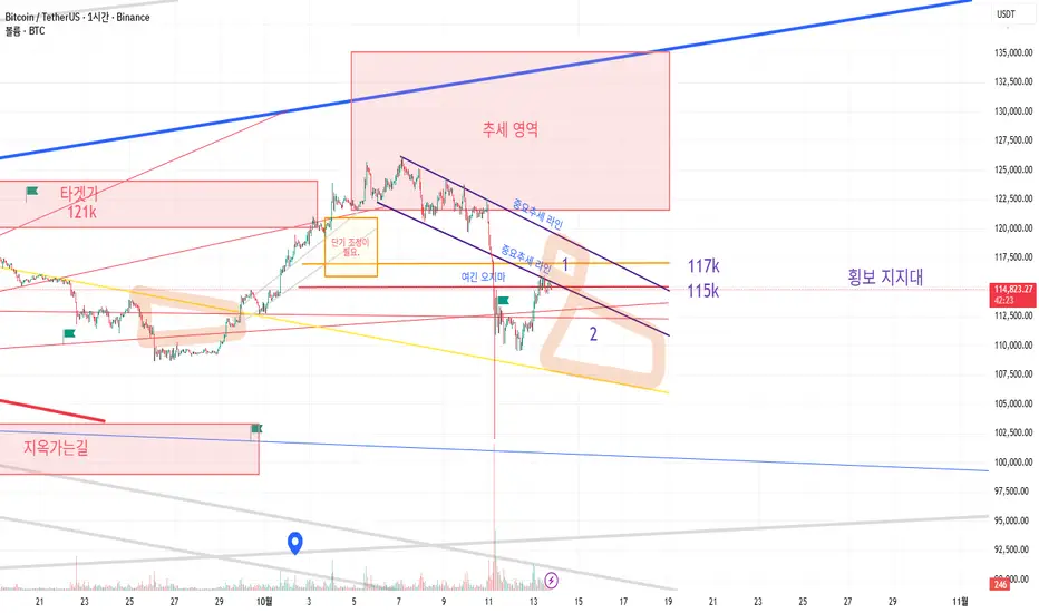 차트의 단기방향을 판단하는 데에 도움이 될 수 있도록 차트분석을 하였습니다. 현재(BTC115k기준) 데드캣 이후, 차트가 직전 하락꼬리를 잡아먹으러가는 n자형 차트가 나올 확률을 무시할 수 없습니다. 중기 숏 차트의 흐름을 벗어나기 위해서는 "1번 영역" 을 잘 돌파하고 지지를 해야하며 이를 실패한다면, "2번 영역"의 기회가 있을 것입니다. 일반적인 시장이 롱포지션의 비율이 우세하기에, 현재 손실중이신 분들이 많을 겁니다. 멘탈관리 잘 하시고 성공적인 투자를 바라겠습니다.