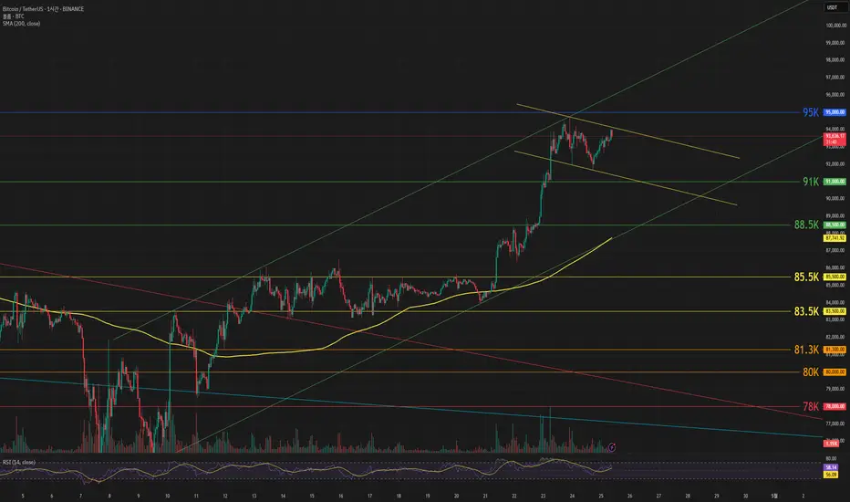 하락 관점으로 94k 돌파하지 못하거나 95k 터치 후에 하락하면서 93k 아래로 떨어지면 91k 까지 열어놓고 대응이 필요해 보입니다.