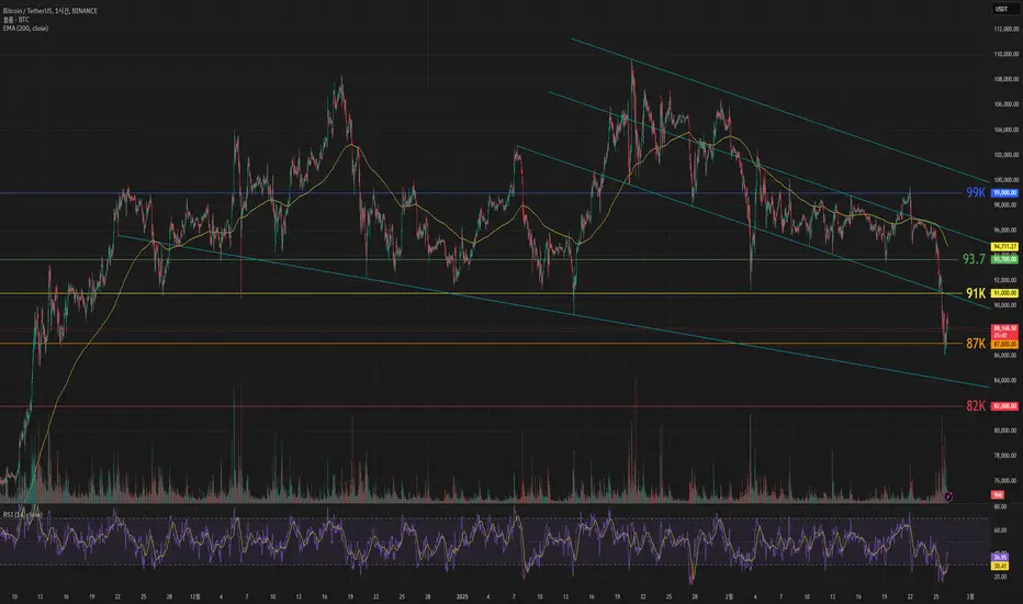 미국 뉴욕 증시의 간판 지수 S&P500이 4거래일 연속 하락했고 나스닥 지수는 올해 들어 마이너스 영역으로 떨어졌습니다. 부진한 소비 신뢰 지표에 경제 불확실성이 더 짙어지면서 매도세가 촉발해 두 지수는 모두 한 달 만에 최저로 내려온 상태입니다. 트럼프의 관세 정책으로 경제 불확실성이 커졌고 해킹 이슈가 뜨면서 86K 까지 떨어졌다가 88.5K 까지 올라온 상태입니다. RSI 과매도 상태이기 때문에 87K 지지 받고 반등하면서 91K 와 하락 추세선 위로 안착한다면 추세 전환을 기대해 볼 수 있을 것으로 보입니다.