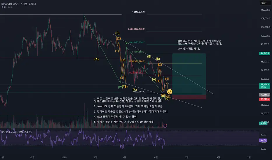 지금 비트코인은 ABC를 반복하고 있고 74.4K 부근 임시저점이 잡히며 횡보상태이다.