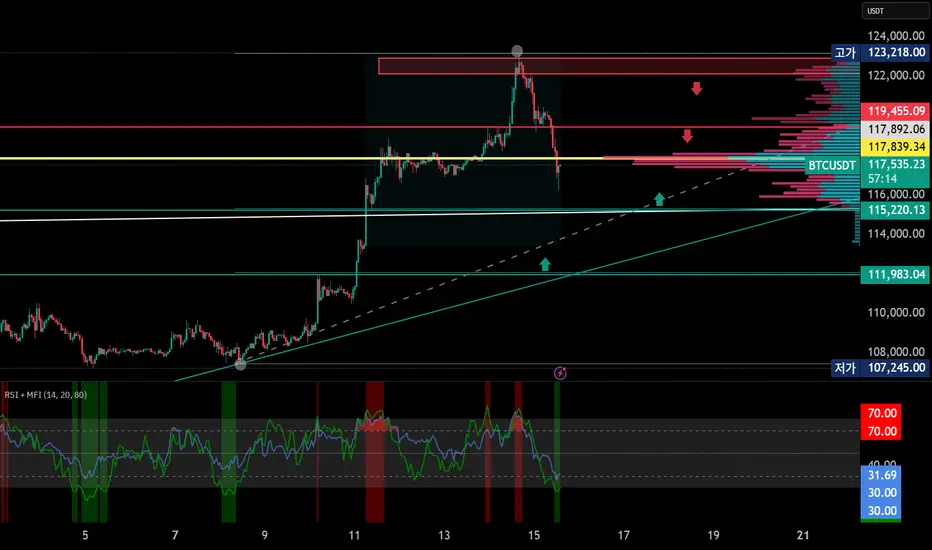 - $115.2K 피보나치 0.5와 조금의 극점이