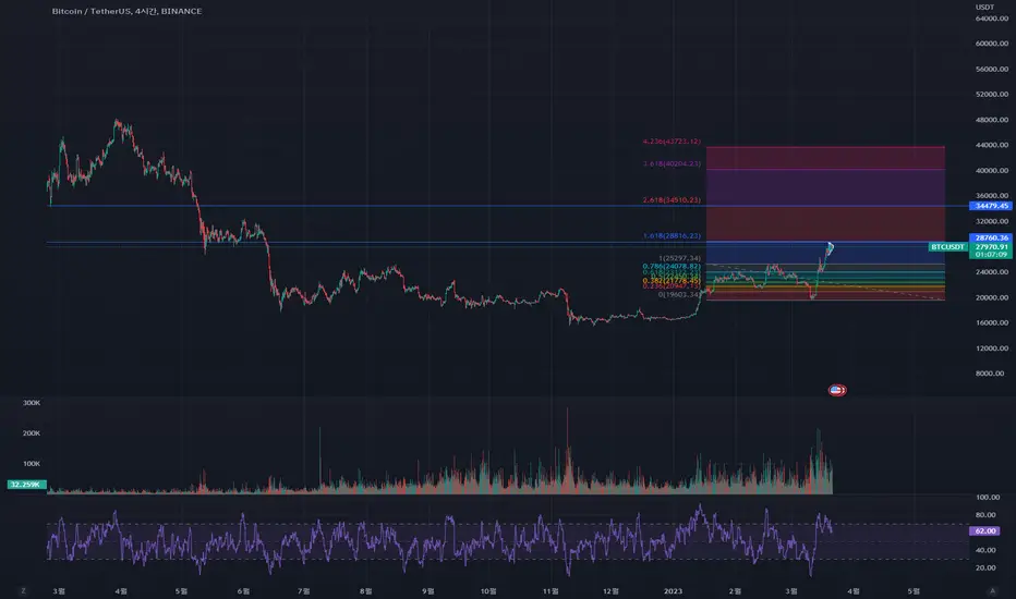 현재 지점은 직전 조정 대비 1.618배 상승한 구간이고, 2.618배 상승한 구간은 약 34.5k로서 22월 1월, 2월 지지선 구간입니다.