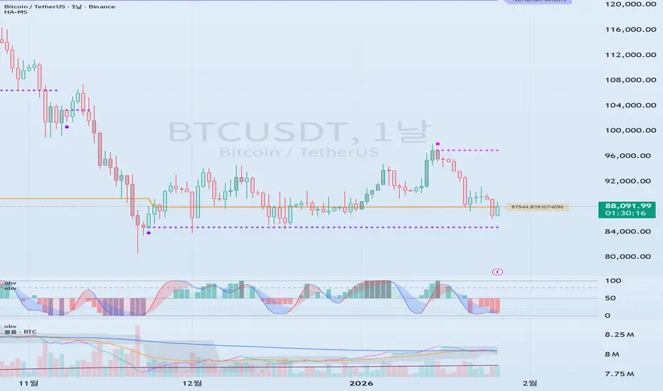 따라서, 가격이 1D 차트의 HA-Low 지표 지점 (87944.84) 에서 하락하더라도 15m 차트의 DOM(-60) ~ HA-Low 구간 부근에서 가격을 유지한다면 재차 상승하려는 시도로 이어지게 될 것 입니다.