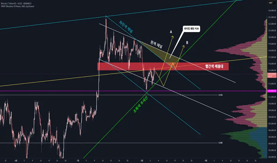 따라서 현시점에서는 빨간색 매물대를 먼저 상방 돌파할지, 아니면 초록색 추세선을 먼저 하방 이탈할지가 관건이며, 그에 따라 시장의 방향성도 결정될 가능성이 큽니다.