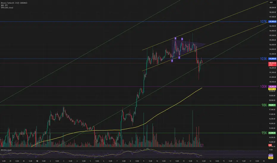 비트코인 가격은 105.8k 에서 100.7k 까지 떨어졌다가 회복하여 103k 저항받으며 횡보중입니다. 이대로 상승하며 103k 위에 안착한다면 104.5k 부근에서 노란색 상승 채널 하단 돌파를 시도 할 것으로 보입니다.