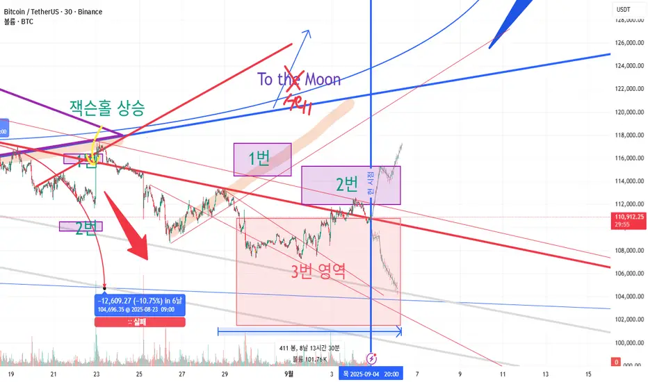 110k 지지에 실패할 경우 하방 이탈이 발생할 수 있습니다. 직전에는 장기 하락 추세를 횡보와 단기 상승으로 돌파했기 때문에, 현재는 롱 매수세가 꾸준히 유입되는 상황입니다. 따라서 기본적으로는 롱 관점에 무게가 실리지만, 만약 휩쏘가 발생해 하방으로 이탈한다면, 고점을 낮추는 형태로 하락세가 진행될 수 있습니다. 이 경우 단기적으로는 102k까지 직행 가능성이 있으며, 98k까지 열려 있는 구간이 존재해 하락 위험 역시 상당합니다.