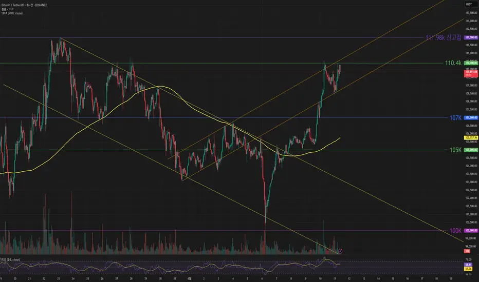 비트코인 가격은 108.3k 까지 떨어졌다가 반등하며 110.4k 까지 올라간 상태입니다. 이대로 110.4k 저항 테스트이후 돌파한다면 신고점을 갱신할 수도 있을 것으로 보입니다.