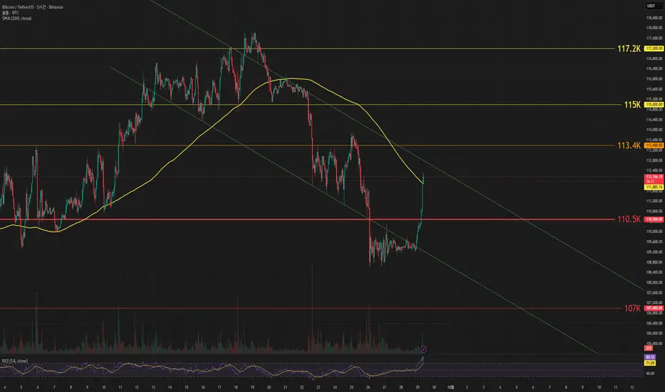 하락 관점으로 200 이평선 아래로 다시 내려간다면 110.5k 까지 떨어질 수 있고 추가 하락이 온다면 107k 까지도 내려올 수 있어서 주의가 필요해 보입니다.