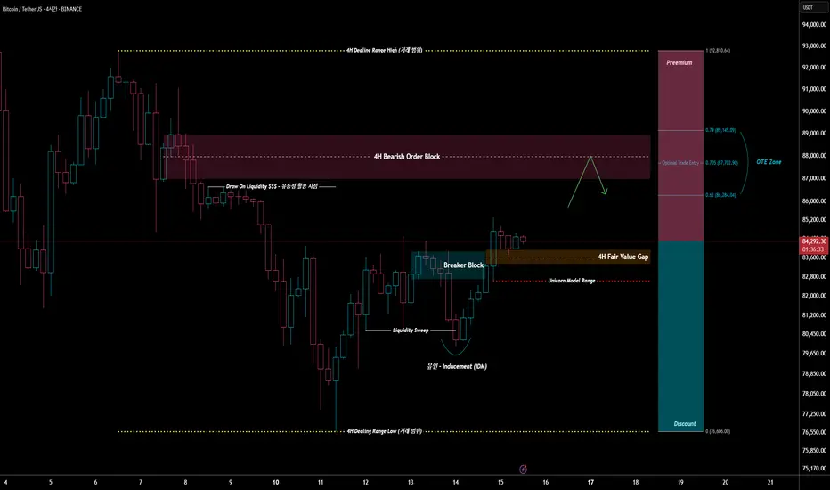 현재 4H FVG의 중간값(50%/CE)에서 가격 반응이 나오고 있는 상황입니다.