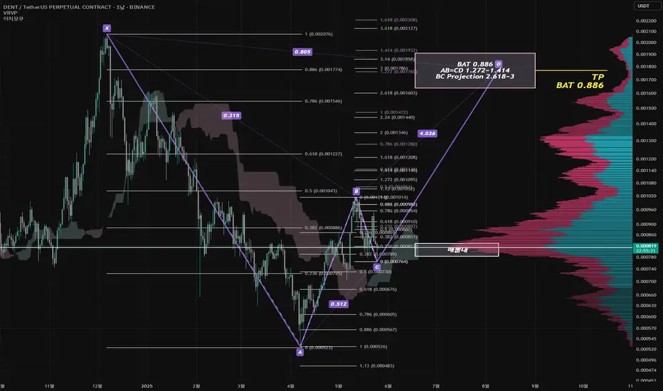 제가 고른 알트코인들은 대체로 24년 12월에 고점 형성 후, 25년 4월 저점을 만들고 XA 축을 이견 없이 제시할 수 있는 코인들입니다. 이에 DENTUSDT는 XA 축에 따른 B점이 25년 5월에 형성되었고 XA 되돌림의 0.5까지 진행된 상태입니다. 이후 AB의 0.382 부근에서 첫번째 상승반전의 신호가 나와서 매수가 들어간 상태입니다. 저는 다이버전스, 캔들패턴 등 여러가지들을 기준점으로 매수를 하였습니다. 특히, 매물대 지표인 VPVR을 기준으로 보아도 AB의 0.382 부근에 매물대라인이 두터운 것을 볼 수 있습니다. 해당 구간에서 상승 반전이 나오고 지지가 된다면 매우 좋은 오더블럭 형태라고 볼 수 있습니다.