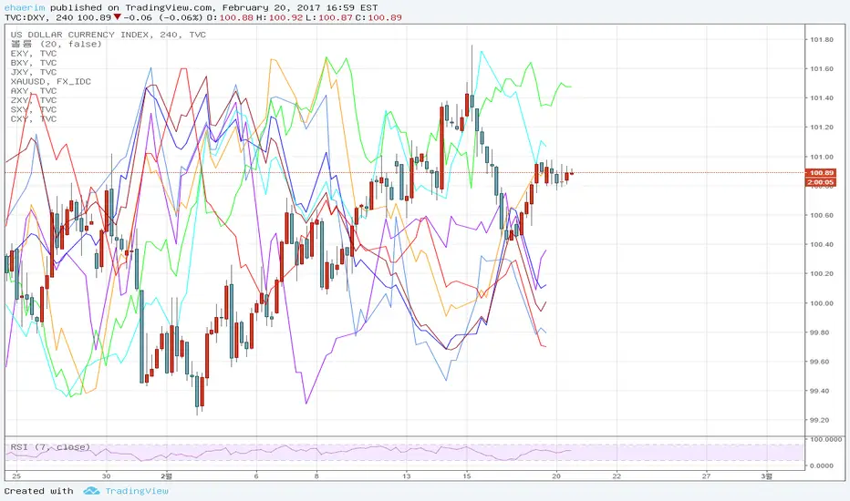 보기로 위 차트에서 USD 를 다른 통화 및 금 (Gold) 에 견주어 보변 아마도 달러 대비 가장 반대로 달리는 통화가 가장 좋은 트레이드가 된다는 것을 알 수 있을 겁니다.