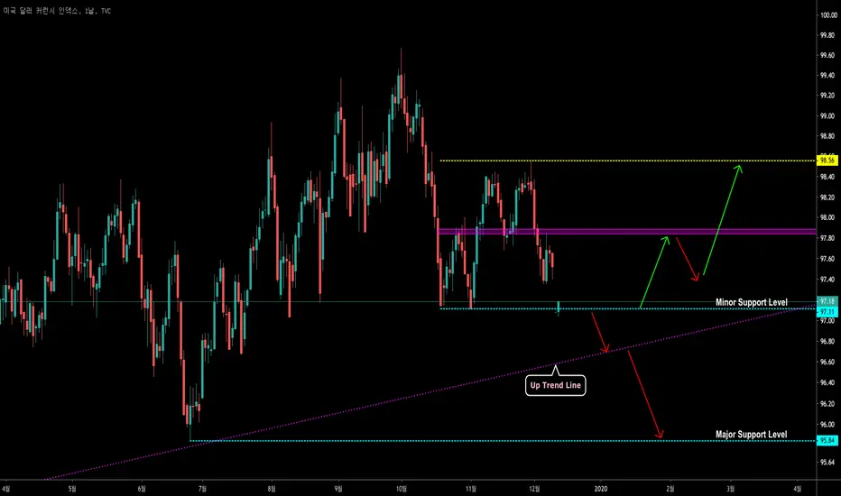 달러는 박스권으로 인식 가능한 하단레벨에 도달했고 현재는 매도세가 우위에 있다고 해석하며 현재 구간에서 매수로서 전략을 갖추려면