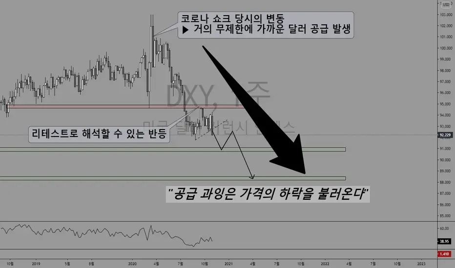 - 연준과 미국정부가 달러 공급을 무제한에 가깝게 공급하면서 달러는 자연스레 공급과잉 상황에 직면하게 되었습니다.