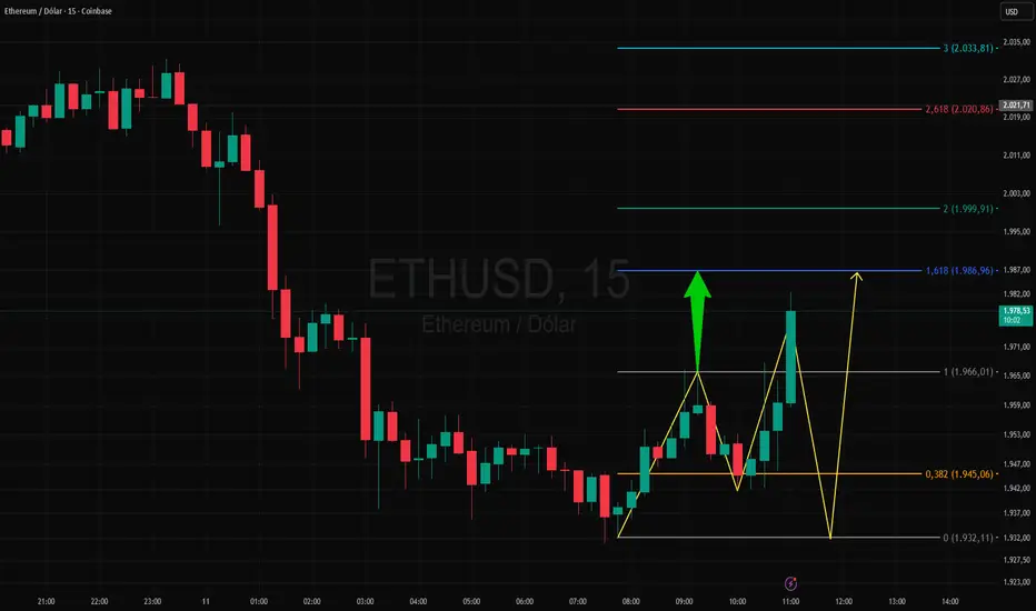 No gráfico de 5 minutos do ETHUSD, rompeu um pivô de alta indicando a busca do(s) alvo(s) da projeção de Fibonacci, poderá retrair gerando um trade com retorno/risco mais favorável.
