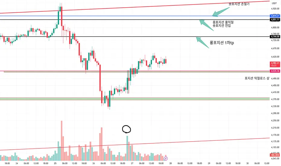 거래량이 터진 양봉의 꼬리에 설정해두었고 이쪽 라인이 무너진다면 그래도 어느정도 하방 압력이