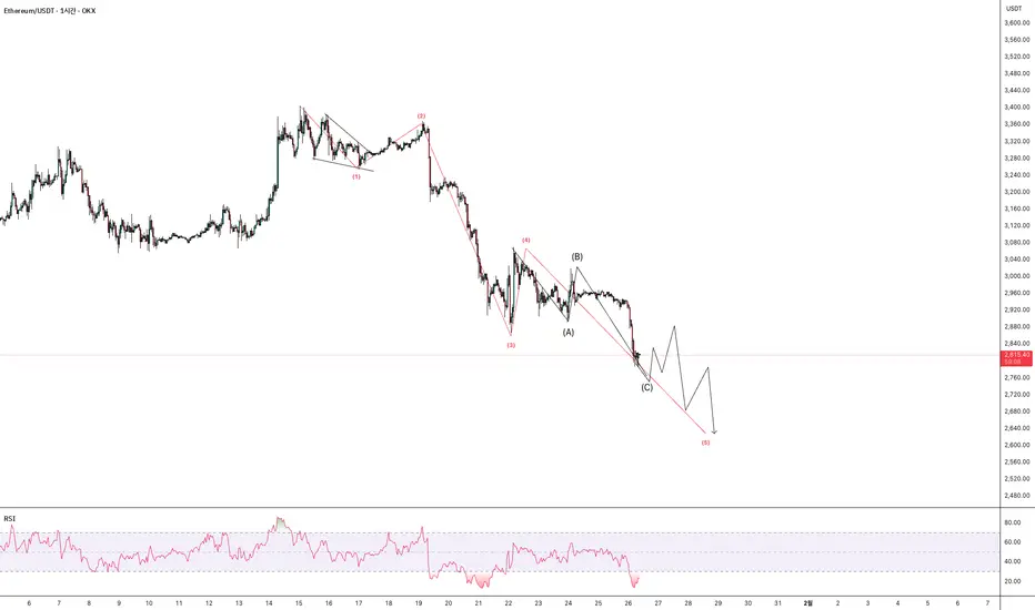 일반적으로 4파 구간에서는 수렴 형태가 자주 나타나지만, 이번 흐름에서는 뚜렷한 수렴 없이 가격 반등 이후 ABC 형태로 저점을 재차 갱신하고 있습니다.