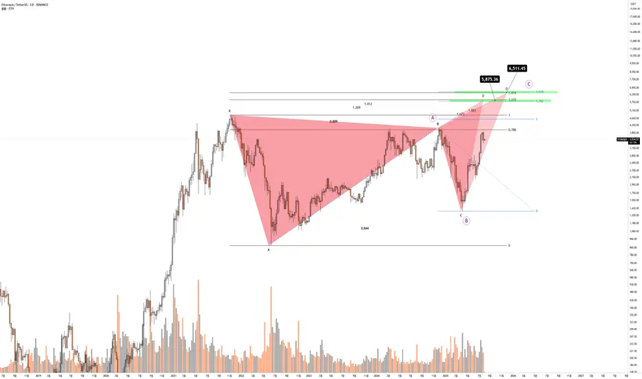 이더리움 같은 경우 저는 5875 & 6511 부근까지는 올라갈거라고 생각하고 있고, $6500 정도가 유력하다고 보고 있습니다. 이유는 ABC 비율 1:1.618 그리고 하모닉 패턴 1.414 버터플라이 패턴이 겹칩니다.