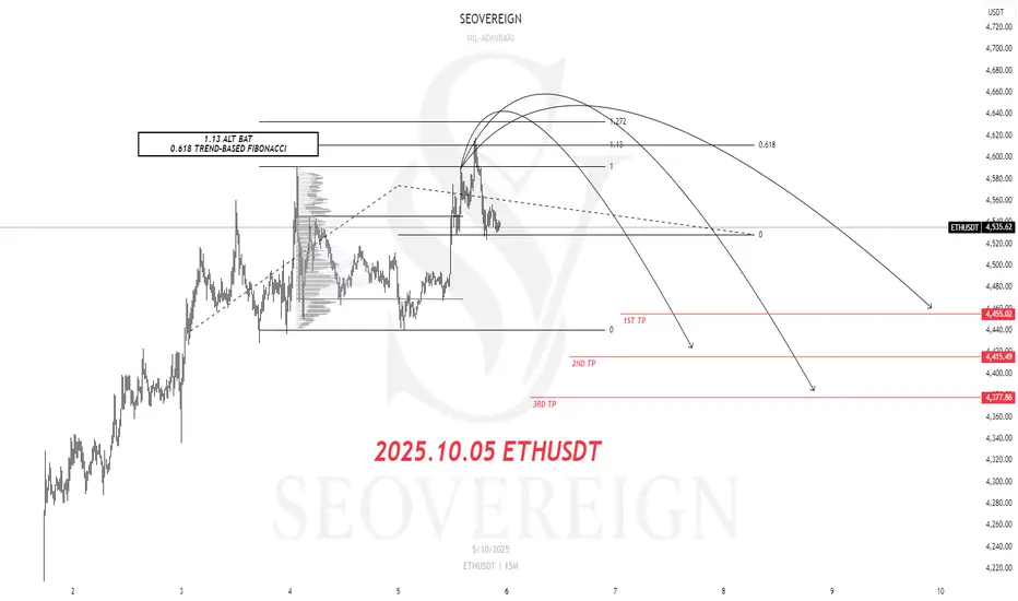 첫째 근거는 1.13 Alternate Bat(ALT BAT)입니다. Alternate Bat은 Scott Carney가 정립한 하모닉 패턴의 변형으로, PRZ(패턴 완성 구역)를 정의할 때 D 지점이 XA의 1.13 배 지점(=1.13XA)에 놓이는 것이 핵심입니다. 이러한 비율들의 수렴은 비교적 좁고 신뢰할 만한 되돌림(혹은 반전) 구간을 만들어 주기 때문에, D가 1.13XA 부근에 위치하면 단기·중기 반전 가능성을 주의 깊게 관찰해야 합니다.