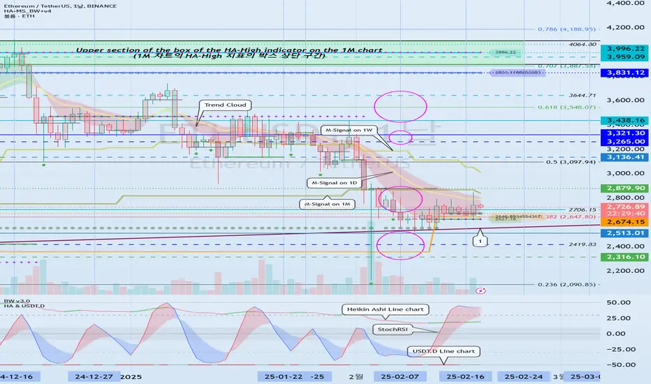 본 차트에서 추세를 알 수 있는 지표는 Trend Cloud 지표와 1D, 1W, 1M 차트의 M-Signal 지표입니다.