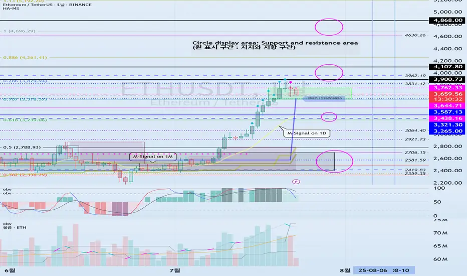 이에 따라서, HA-High 지표가 새롭게 생성된다면, 3587.13-3762.33 구간에서 지지 여부가 중요한 관건입니다.