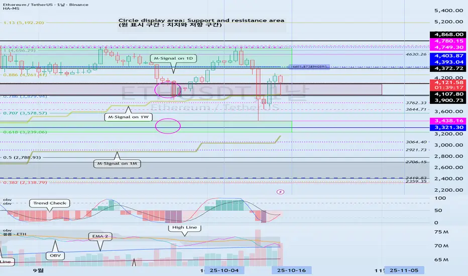 그러므로, 1W 차트와 1D 차트의 HA-High ~ DOM(60) 구간에 해당되는 4393.04-4780.15 구간을 이번 변동성 기간을 지나면서 상승할 수 있는지가 관건입니다.