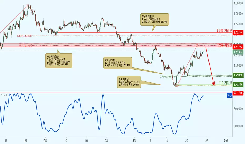EURCAD 가격은 현재 첫번째 저항선 1.5314 (수평 오버랩 저항선, 피보나치 조정 비율 50%, 피보나치 확장 61.8%) 접근 하고 있으며 이 저항선의 반응으로 인해 주요 지지선 1.4813 (수평 스윙 로우 지지선, 피보나치 확장 100%)까지 하락 할 가능성이 있습니다. 중간 지지선 1.4905 (수평 스윙 로우 지지선, 피보나치 조정 비율 76.4%)돌파로는 주요 지지선 접근에 대한 한단계에 또 다른 신호라고 볼수 있습니다.