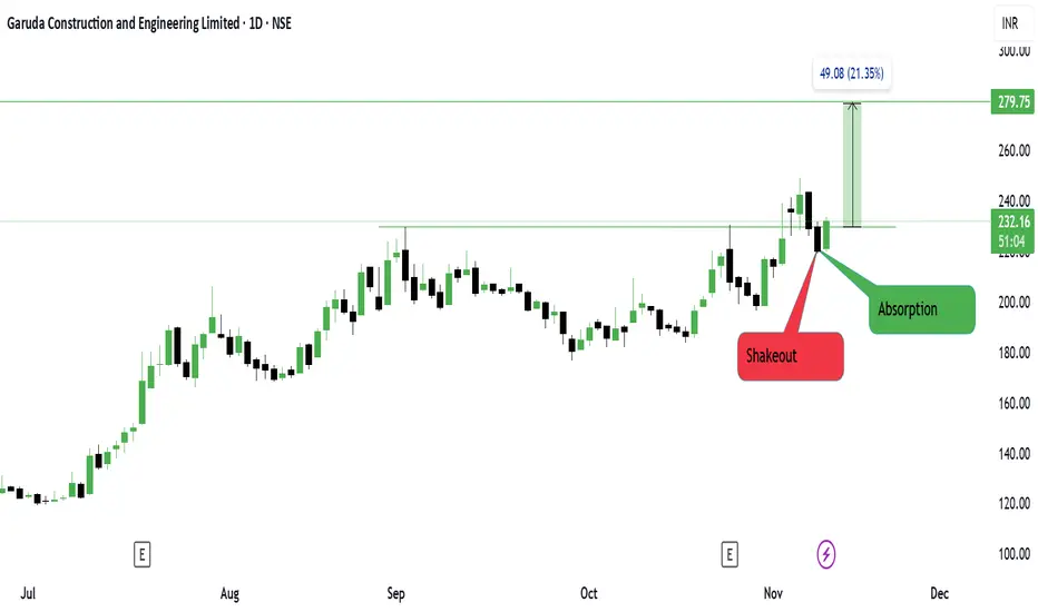 Garuda Construction is showing a **clean shakeout and absorption sequence** on the daily chart. After weeks of tight consolidation, the stock broke below its short-term base near 200, triggering a shakeout phase that absorbed weak hands.