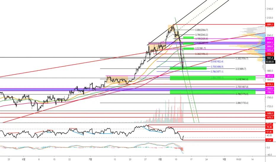 - 지지 성공한 빨간색 쐐기 하단, 혹은 빨간색 장기 상승 추세선 이탈 여부에 주목해주세요. 추가 하락이 나온다면 고려중인 메이저 지지구간은 1838~1858과 1775~1795입니다.