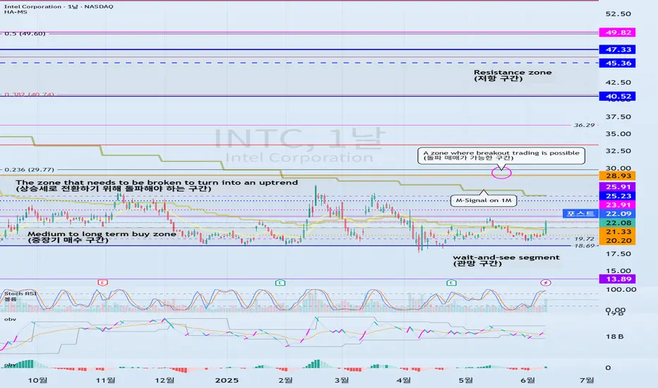 중장기 매수 구간인 18.69-21.33 구간 이상 상승한 모습을 보여주고 있습니다.
