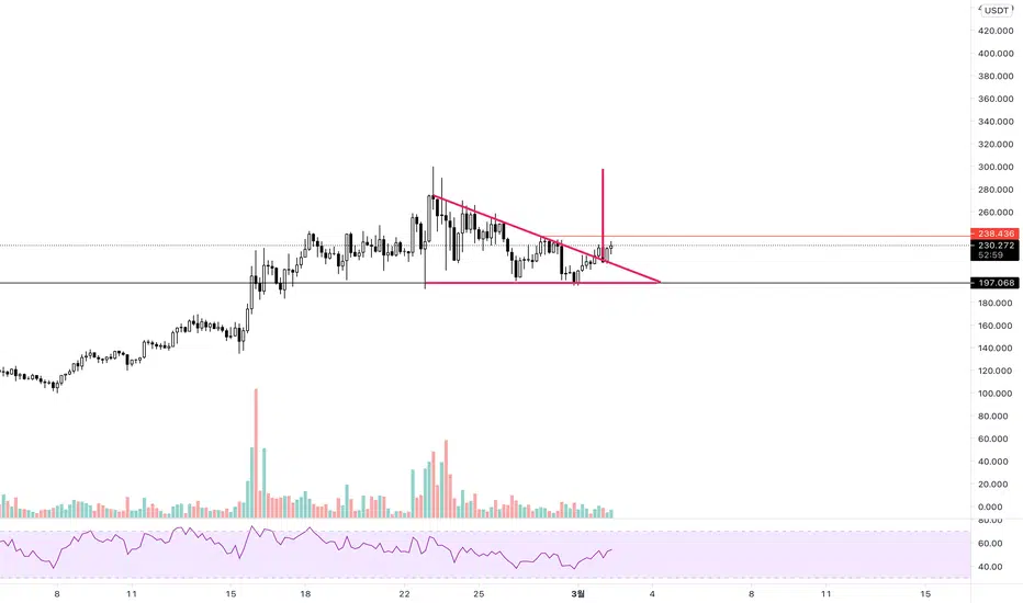 쿠사마 4시간봉 기준 삼각형 패턴의 상단 저항선을 돌파 후 지지 받음.